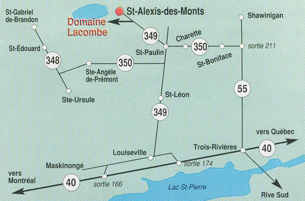 Situé à seulement deux kilomètres avant le village de St-Alexis-des-Monts et près de la réserve faunique de Mastigouche, le Domaine Lacombe se trouve donc accommodé de plusieurs services tel que les restaurants, la SAQ, l'épicerie, etc.